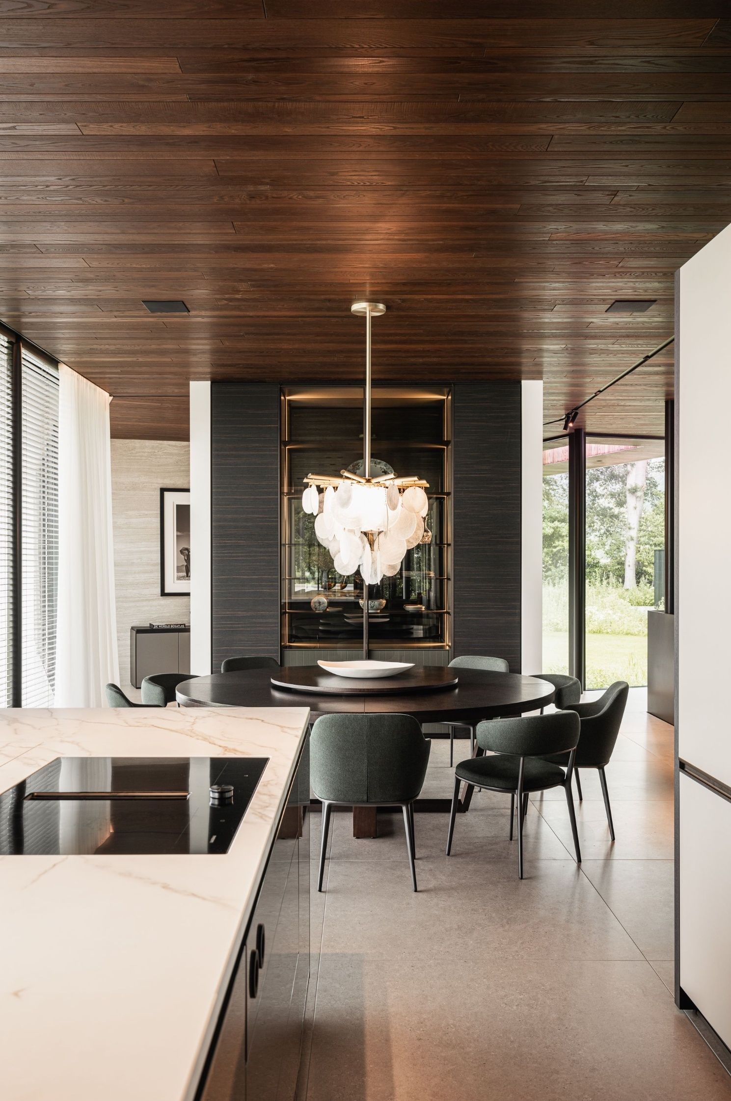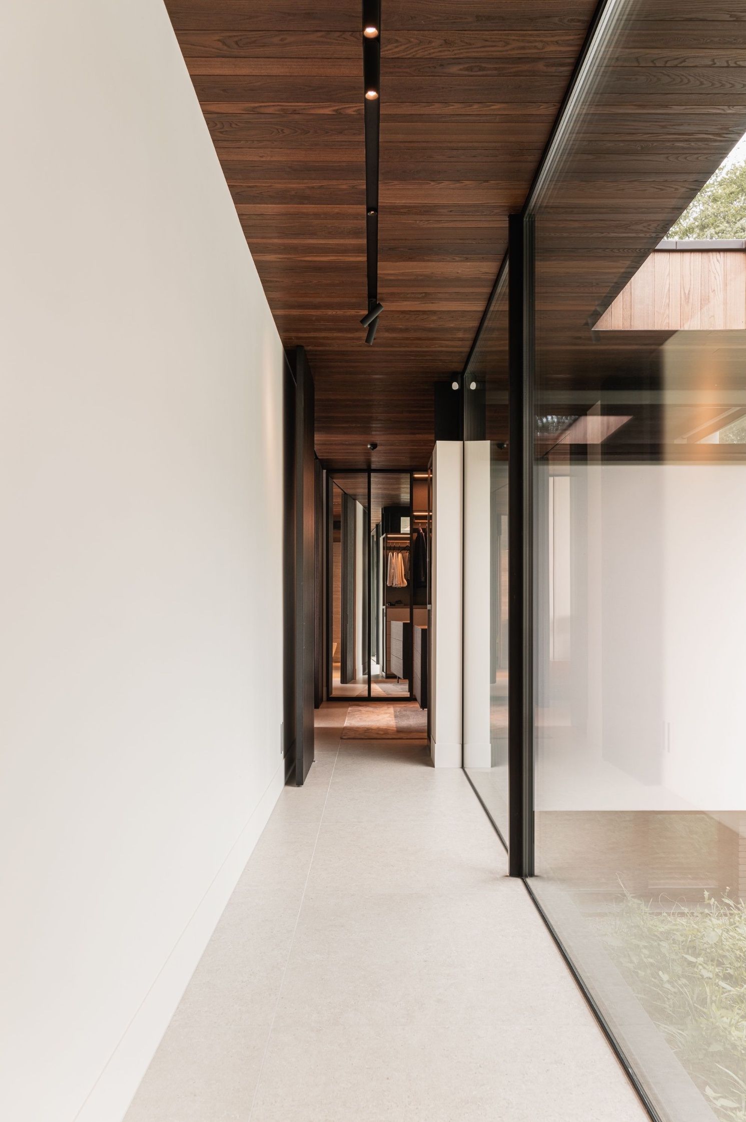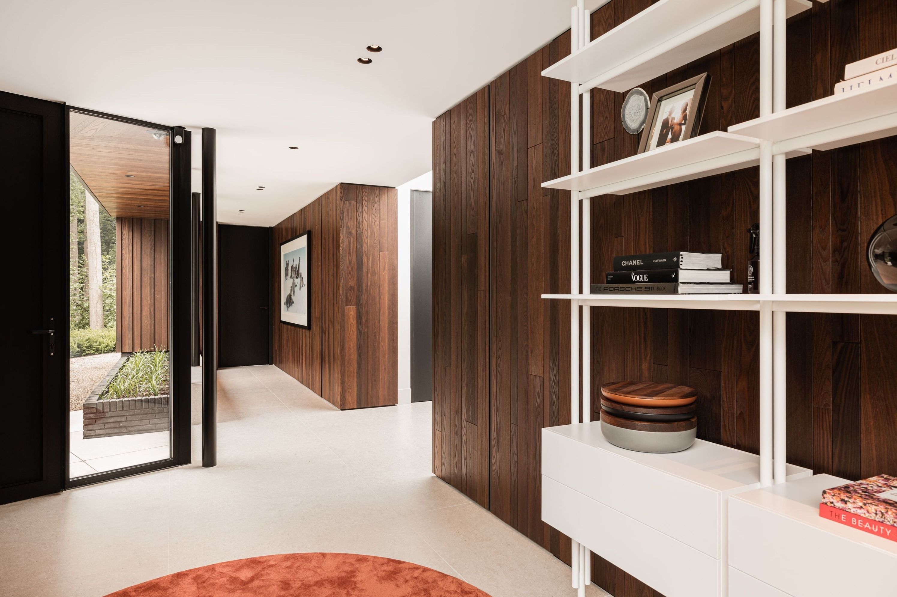 Een deel van de wanden is bekleed met thermisch gemodificeerd essenhout, DumoWood X-line, in verschillende breedtes. Deze speelse variatie weerspiegelt de onregelmatigheid van de natuur.